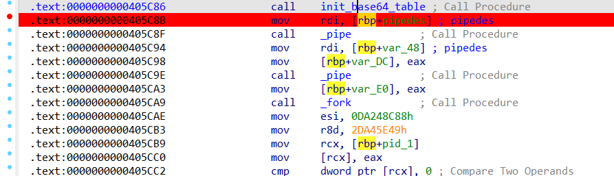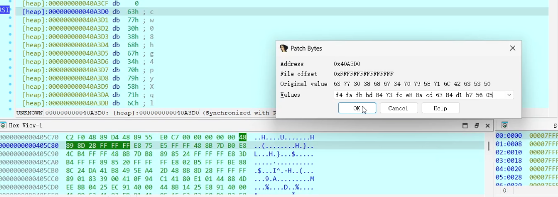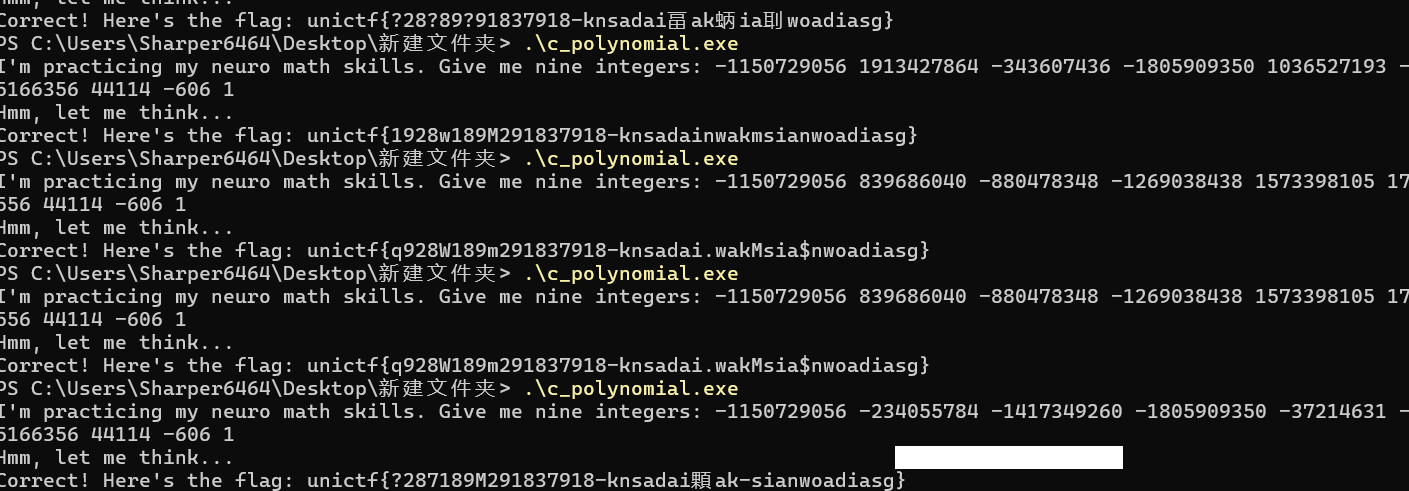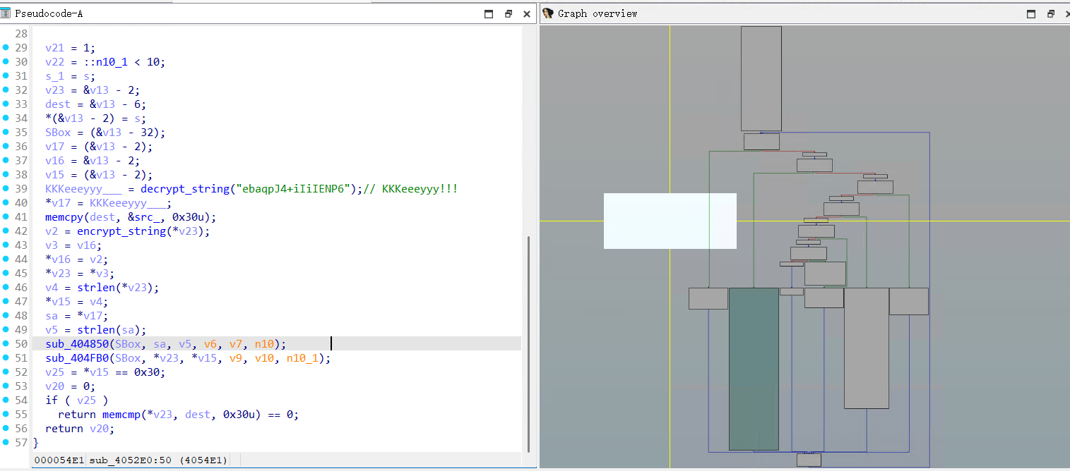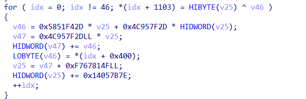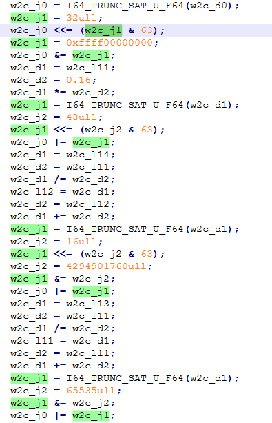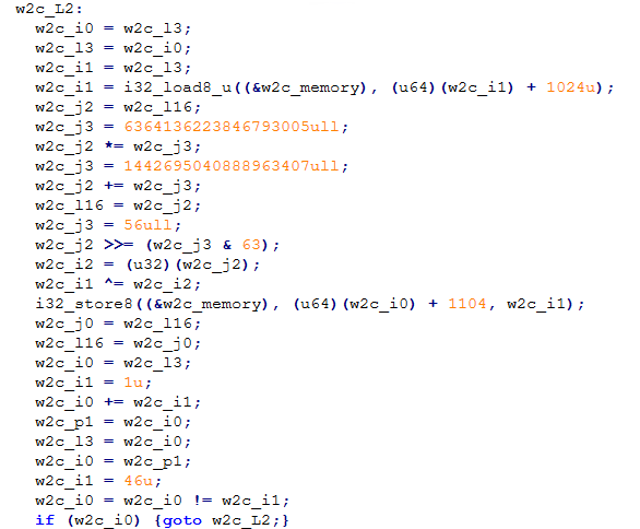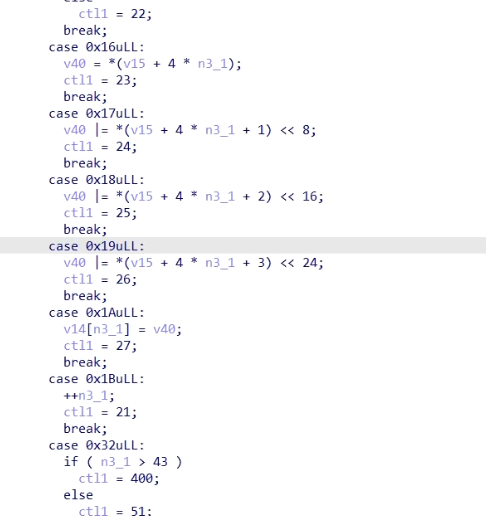while PC < len(opcode): mask = (1<<64)-1 match opcode[PC]: case 0x00: break case 0x01: op0,op1 = opcode[PC+1]&0x0F,unpack("<Q",opcode[PC+2:PC+2+8])[0] stack[op0] = op1 PC += 10 case 0x02: op0,op1 = opcode[PC+1]&0x0F,unpack("<H",opcode[PC+2:PC+2+2])[0] stack[op0] = z3.ZeroExt(56,buffer[op1]) PC += 4 case 0x03: op0,op1 = unpack("<H",opcode[PC+1:PC+1+2])[0],opcode[PC+3]&0x0F buffer[op0] = z3.Extract(7,0,stack[op1]) PC += 4 case 0x05: op0,op1,op2 = opcode[PC+1]&0x0F,opcode[PC+2]&0x0F,opcode[PC+3]&0x0F num1,num2 = stack[op1],stack[op2] num0 = (num1+num2)&mask stack[op0] = num0 PC += 4 case 0x07: op0,op1,op2 = opcode[PC+1]&0x0F,opcode[PC+2]&0x0F,opcode[PC+3]&0x0F num1,num2 = stack[op1],stack[op2] num0 = (num1*num2)&mask stack[op0] = num0 PC += 4 case 0x0A: op0,op1,op2 = opcode[PC+1]&0x0F,opcode[PC+2]&0x0F,opcode[PC+3]&0x0F num1,num2 = stack[op1],stack[op2] num0 = (num1^num2)&mask stack[op0] = num0 PC += 4 case 0x0F: op0,op1,op2 = opcode[PC+1]&0x0F,opcode[PC+2]&0x0F,opcode[PC+3] num1 = stack[op1] num0 = (num1 >> op2)&mask stack[op0] = num0 PC += 4 case 0x10: op0,op1 = opcode[PC+1]&0x0F,opcode[PC+2]&0x0F num1,num2 = stack[op0],stack[op1] ZF = num1 == num2 CF = num1 < num2 PC += 3 case 0x13: op0 = unpack("<H",opcode[PC+1:PC+1+2])[0] if PC == 0x0923: solver.add(ZF == True) PC += 3 continue if ZF: PC += 3 else :PC = op0 if PC > len(opcode):break case 0x14: op0,op1 = opcode[PC+1]&0x0F,opcode[PC+2]&0x0F num1 = stack[op1] num0 = rand_array[num1] stack[op0] = z3.ZeroExt(56,num0) PC += 3 case 0x15: rol = lambda num,bits:((num<<bits) | (num>>(64-bits)))&mask op0,op1,op2 = opcode[PC+1]&0x0F,opcode[PC+2]&0x0F,opcode[PC+3] num1 = stack[op1] num0 = rol(num1,op2) stack[op0] = num0 PC += 4 case 0x17: op0,op1 = opcode[PC+1]&0x0F,opcode[PC+2]&0x0F num1 = stack[op1] num0 = buffer[num1] if isinstance(num0,z3.BitVecRef):num0 = z3.ZeroExt(56,num0) stack[op0] = num0 PC += 3 case 0xFF: break case default: raise NotImplementedError(f"Unkonwn opcode 0x{default:02X}")
