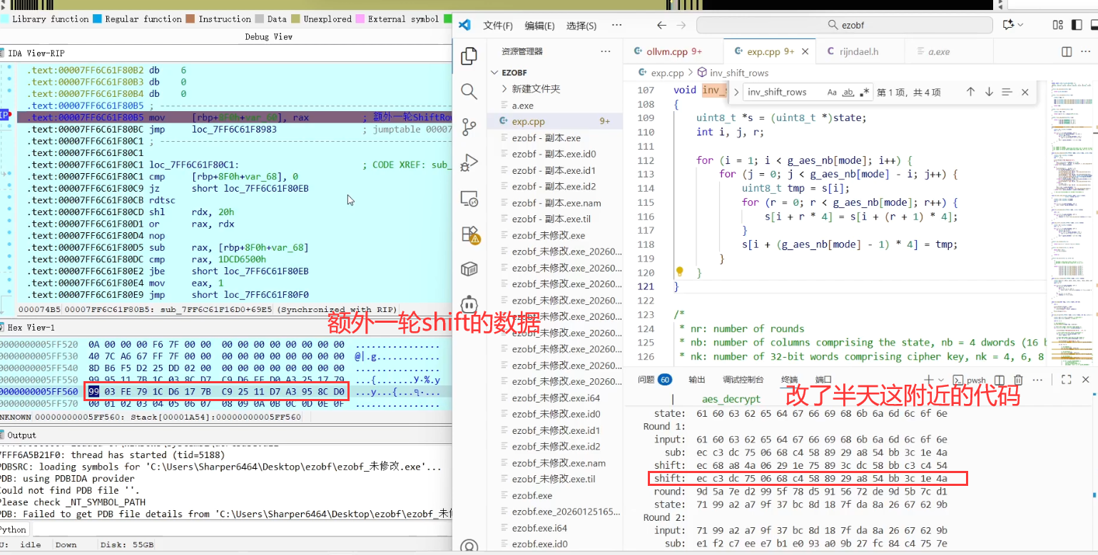 _rand_array = [0x9B, 0x71, 0x29, 0x14, 0xD4, 0x35, 0x39, 0x64, 0x3D, 0x95, 0x9A, 0x93, 0xF6, 0xC7, 0x22, 0x58, 0xD0, 0xB4, 0xEE, 0x4F, 0x88, 0x2D, 0x4, 0x51, 0x6A, 0xE7, 0xA9, 0x7, 0x24, 0x3F, 0x46, 0xF1, 0xA1, 0x3A, 0x1F, 0x5F, 0xCA, 0x12, 0xE2, 0x24, 0xD6, 0xB7, 0xA6, 0x25, 0x69, 0xE3, 0x40, 0xA5, 0x5A, 0x49, 0xA8, 0x92, 0xF1, 0xCF, 0x20, 0x73, 0x1A, 0x81, 0xB4, 0xEA, 0x29, 0x9B, 0x56, 0xAB, 0x9F, 0x92, 0x1, 0x28, 0xC0, 0xEA, 0x63, 0x99, 0x83, 0x12, 0x18, 0x8B, 0x59, 0x9D, 0x35, 0xEC, 0xAD, 0x5C, 0x6D, 0x2E, 0x86, 0x57, 0x9D, 0x68, 0xF9, 0x94, 0x3C, 0xA, 0xF0, 0x42, 0x3F, 0x84, 0x1F, 0xB6, 0xF4, 0x5, 0x1F, 0x99, 0x3, 0xBF, 0xF0, 0x25, 0xE2, 0xEC, 0xAB, 0xA4, 0x5C, 0xAC, 0x52, 0xAC, 0x14, 0x86, 0xBC, 0x17, 0xE8, 0xFB, 0x79, 0xE9, 0x87, 0x10, 0x25, 0x0, 0x2F, 0xFD, 0x5C, 0x7F, 0x1E, 0xD1, 0x87, 0xC5, 0x97, 0x5D, 0x5C, 0xA7, 0x2, 0xAA, 0x42, 0xD4, 0xCA, 0x27, 0x91, 0xE0, 0x50, 0xB6, 0x1C, 0x4, 0x1E, 0x42, 0x4B, 0xE8, 0x54, 0x6A, 0xF0, 0xCB, 0xD1, 0xFB, 0xA1, 0x34, 0x9A, 0xCE, 0xCB, 0xCD, 0xB, 0x4A, 0x2D, 0x98, 0xA8, 0xBB, 0x3A, 0x65, 0x14, 0xE7, 0x4B, 0xD5, 0x1D, 0x2F, 0xBF, 0x22, 0x1E, 0x61, 0x76, 0x2F, 0x8D, 0x30, 0xB0, 0x6C, 0x99, 0xCA, 0x9F, 0x5C, 0x5D, 0xC8, 0xE9, 0xBC, 0xF0, 0xA9, 0x94, 0x57, 0x62, 0xF, 0x22, 0x21, 0x1E, 0x3B, 0xD7, 0xEE, 0x24, 0x5E, 0xC9, 0xFF, 0x8C, 0x4C, 0x75, 0x1E, 0xF0, 0x4, 0xB2, 0x38, 0xC, 0x20, 0xC6, 0x8C, 0x1F, 0x33, 0x6, 0x38, 0xFF, 0x2F, 0x1D, 0xAB, 0x45, 0xF3, 0x35, 0x92, 0xE2, 0xBD, 0xD7, 0x69, 0x28, 0x4A, 0xDE, 0x19, 0xDB, 0x8A, 0x4F, 0x6E, 0xB5, 0xF4, 0xED, 0xBD, 0xC, 0x1B] rand_array = z3.Array('rand_array', z3.BitVecSort(64),z3.BitVecSort(8)) flag = z3.BitVecs(" ".join(f"idx{i}" for i in range(32)),8) for i in range(len(_rand_array)): rand_array = z3.Store(rand_array,i,_rand_array[i]) stack = [0]*0x20 buffer = [0]*0x400 for i in range(len(flag)): buffer[i] = flag[i] for i in range(len(enc)): buffer[0x210+i] = enc[i]